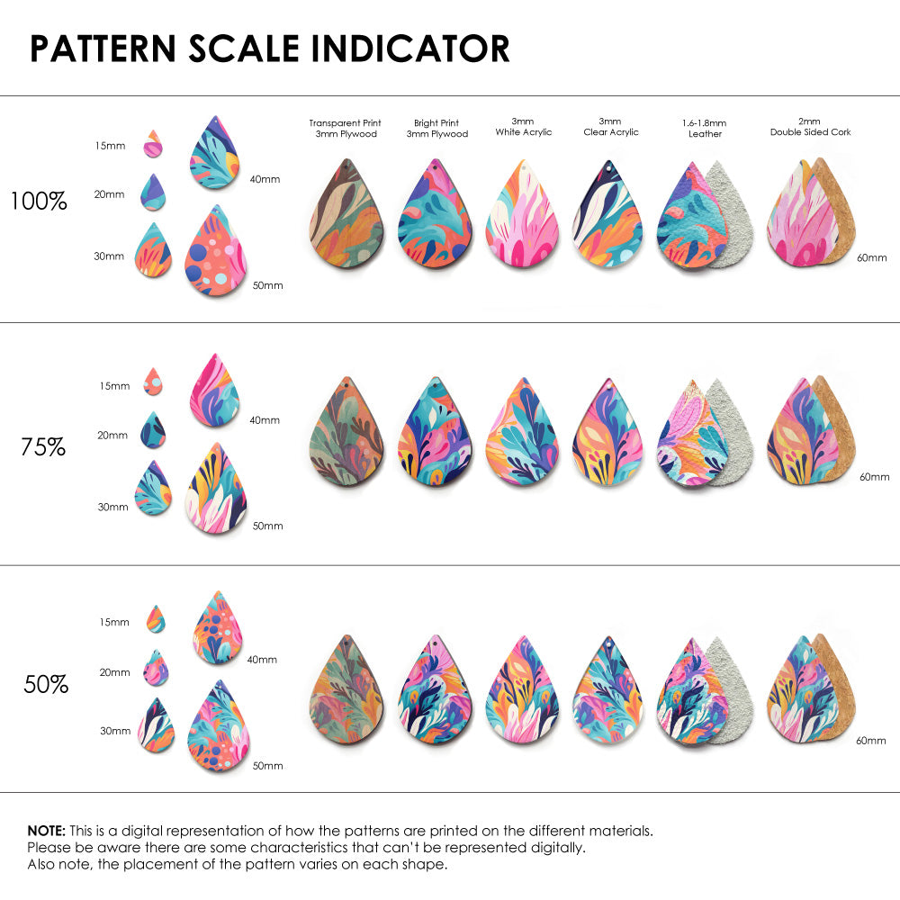 Our patterns can be printed onto Genuine Cowhide Leather, Double Sided Cork, Pine Plywood, White Acrylic or Clear Acrylic or Yupo Paper sheets or earring blanks for making your own earrings. Simply add your own embellishments and findings to make them truly your own.