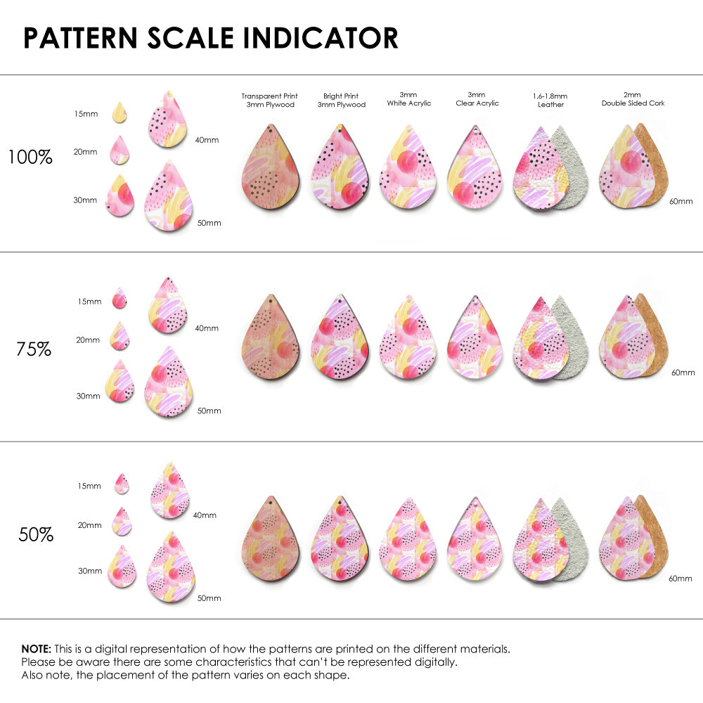 Our patterns can be printed onto Genuine Cowhide Leather, Double Sided Cork, Pine Plywood, White Acrylic or Clear Acrylic or Yupo Paper sheets or earring blanks for making your own earrings. Simply add your own embellishments and findings to make them truly your own.