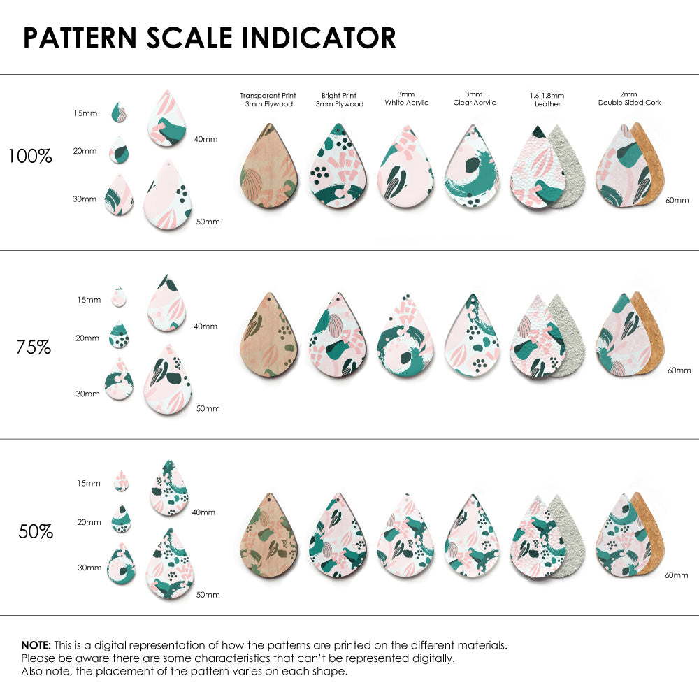 The catalogue image shown is one repeat. If the pattern is seamless, we repeat the pattern to fit to the sheet size, and then scale it so it is suitable for small pieces like earrings.