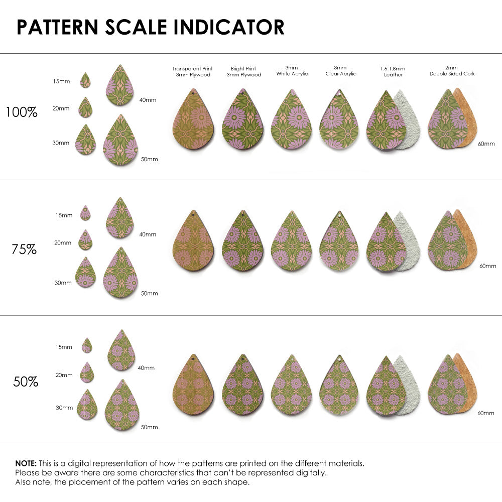 The catalogue image shown is one repeat. If the pattern is seamless, we repeat the pattern to fit to the sheet size, and then scale it so it is suitable for small pieces like earrings.