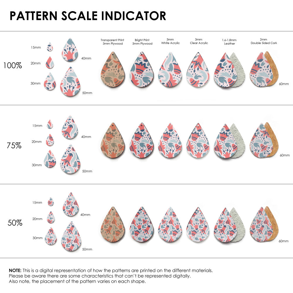 Our patterns can be printed onto Genuine Cowhide Leather, Double Sided Cork, Pine Plywood, White Acrylic or Clear Acrylic or Yupo Paper sheets or earring blanks for making your own earrings. Simply add your own embellishments and findings to make them truly your own.