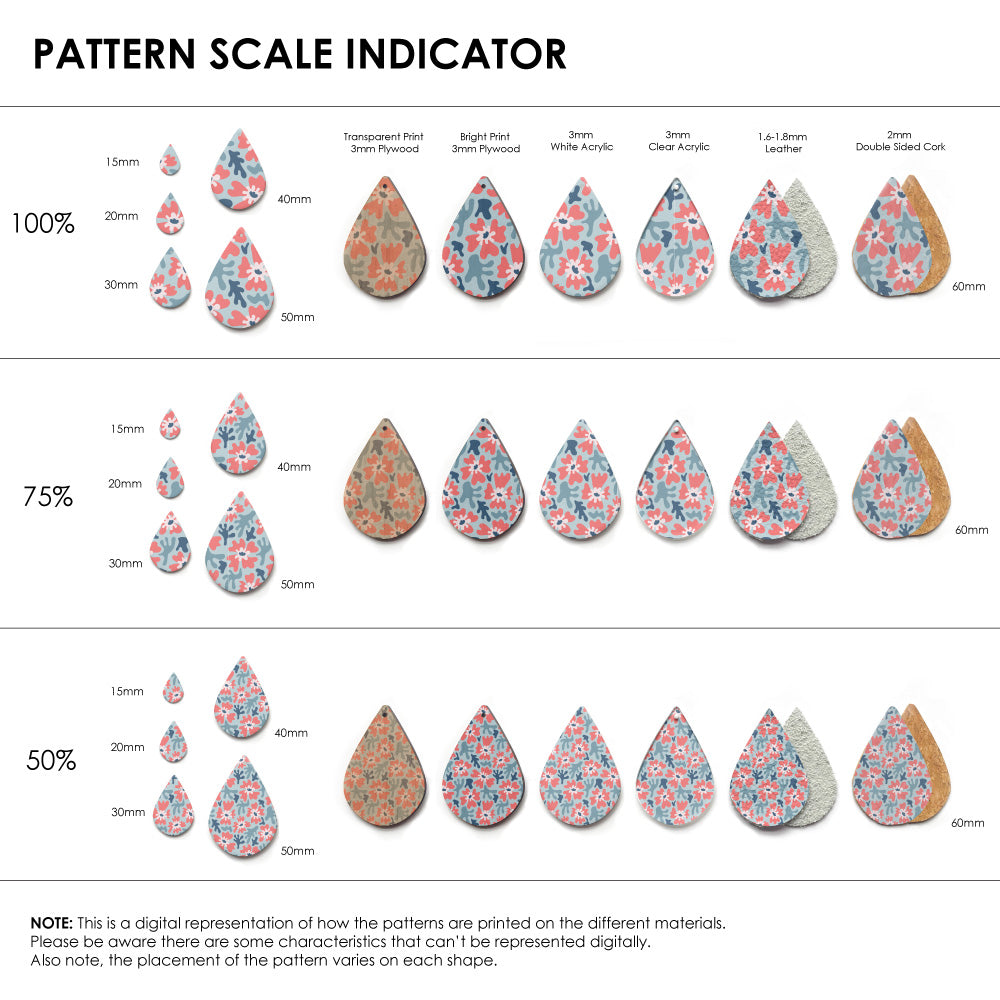 The catalogue image shown is one repeat. If the pattern is seamless, we repeat the pattern to fit to the sheet size, and then scale it so it is suitable for small pieces like earrings.