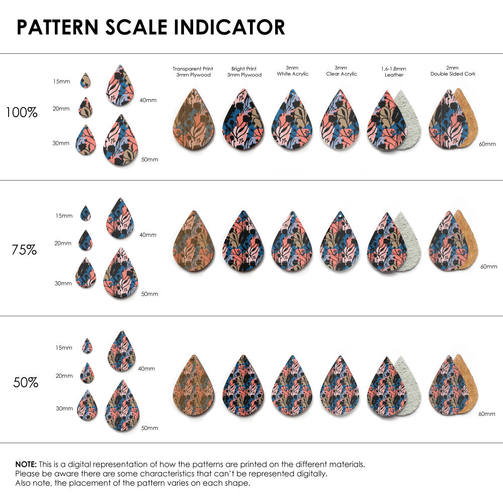 Our patterns can be printed onto Genuine Cowhide Leather, Double Sided Cork, Pine Plywood, White Acrylic or Clear Acrylic or Yupo Paper sheets or earring blanks for making your own earrings. Simply add your own embellishments and findings to make them truly your own.