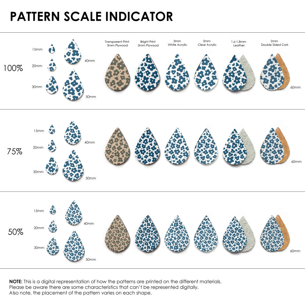 The catalogue image shown is one repeat. If the pattern is seamless, we repeat the pattern to fit to the sheet size, and then scale it so it is suitable for small pieces like earrings.