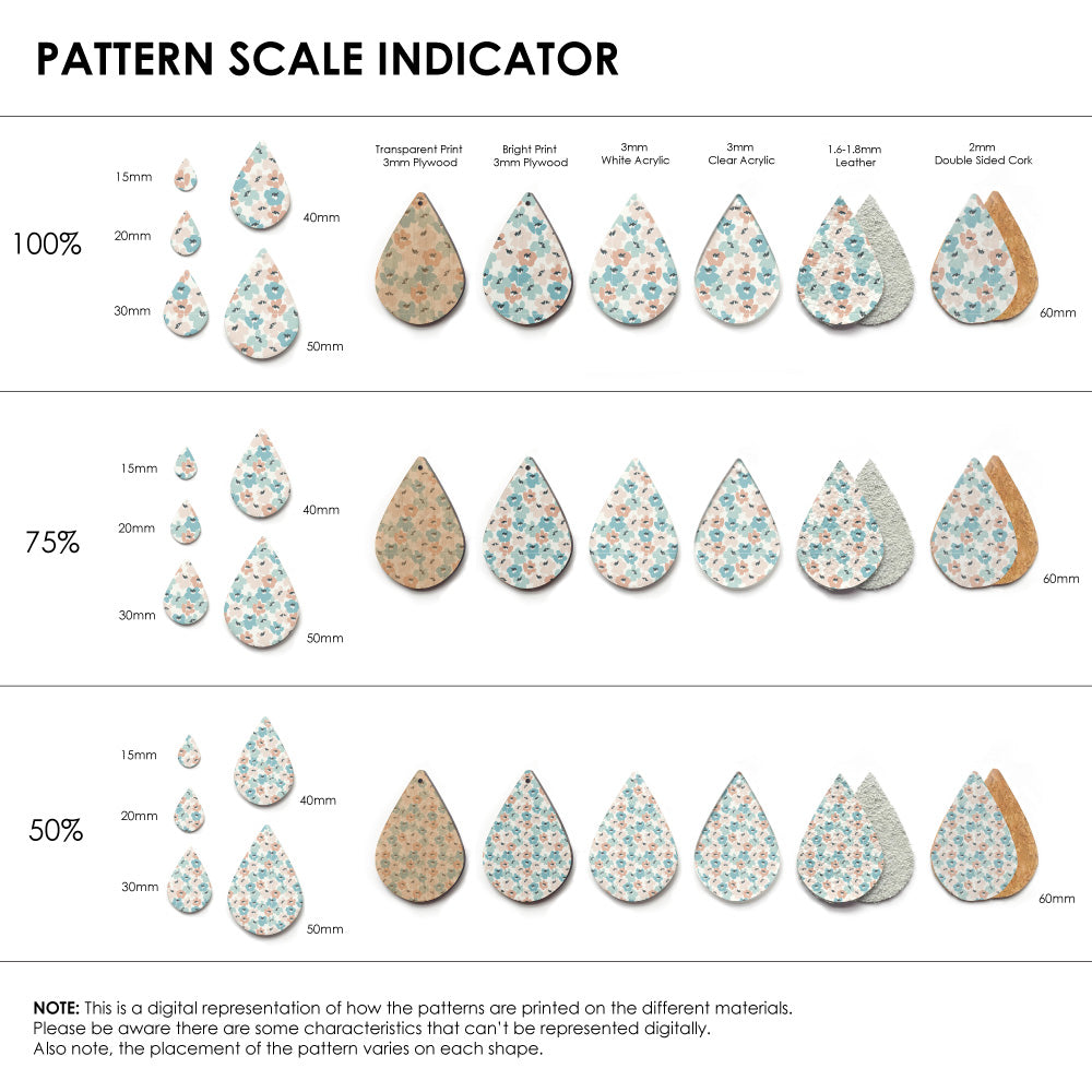 The catalogue image shown is one repeat. If the pattern is seamless, we repeat the pattern to fit to the sheet size, and then scale it so it is suitable for small pieces like earrings.