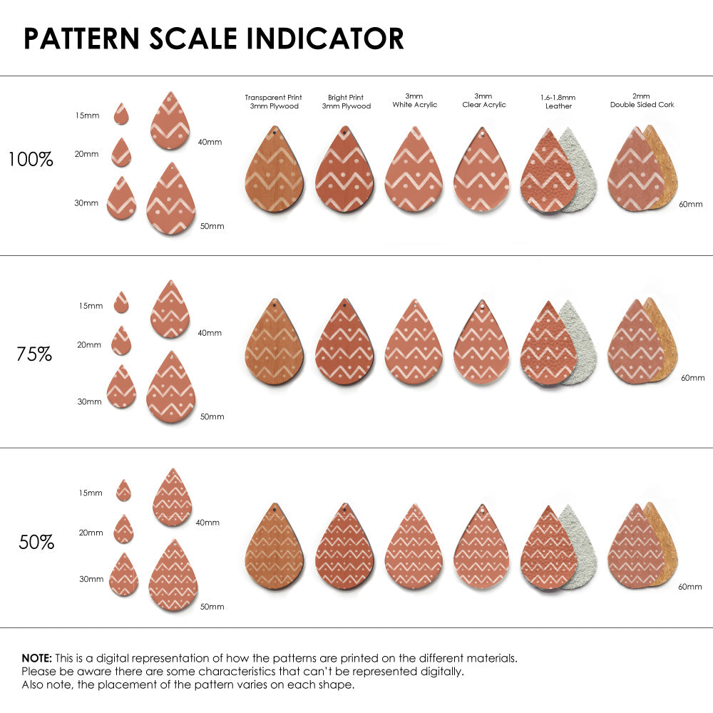 Our patterns can be printed onto Genuine Cowhide Leather, Double Sided Cork, Pine Plywood, White Acrylic or Clear Acrylic or Yupo Paper sheets or earring blanks for making your own earrings. Simply add your own embellishments and findings to make them truly your own.