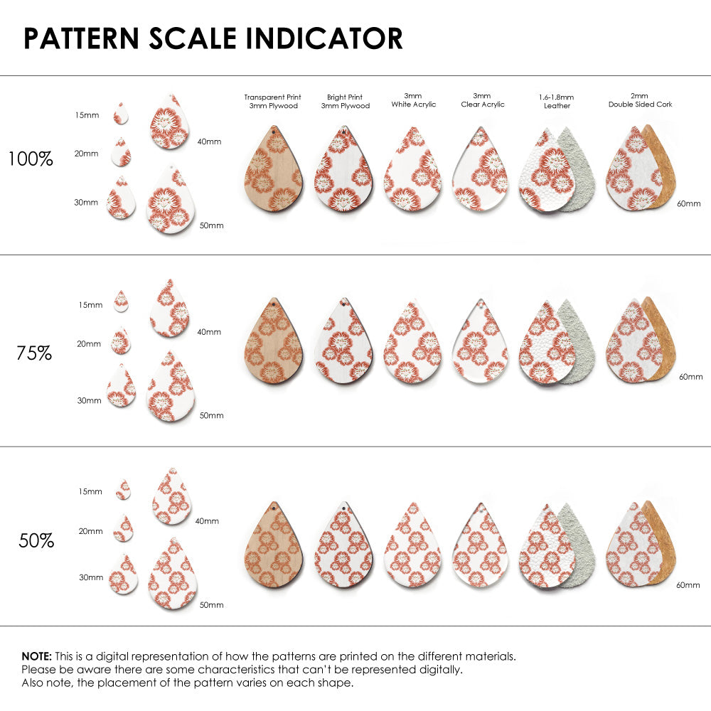 The catalogue image shown is one repeat. If the pattern is seamless, we repeat the pattern to fit to the sheet size, and then scale it so it is suitable for small pieces like earrings.