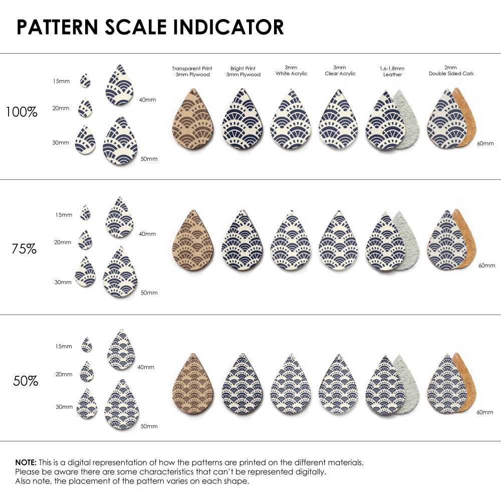 The catalogue image shown is one repeat. If the pattern is seamless, we repeat the pattern to fit to the sheet size, and then scale it so it is suitable for small pieces like earrings.