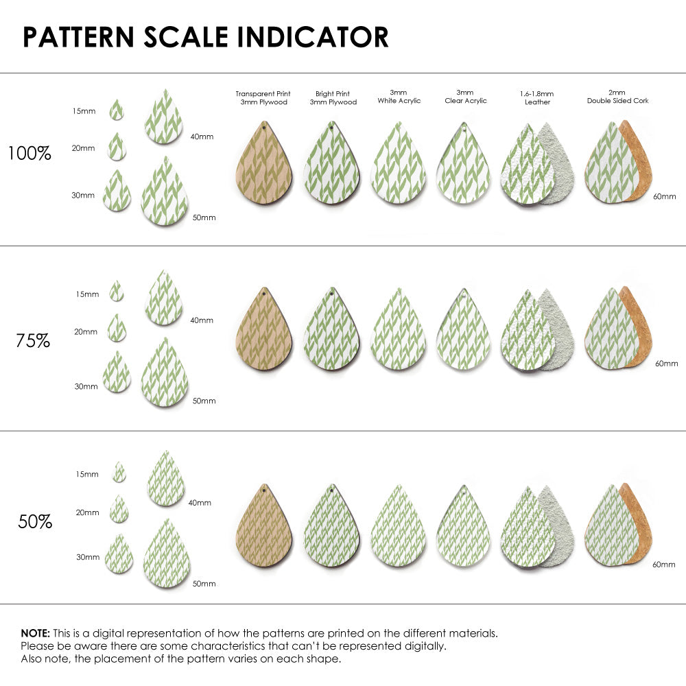 The catalogue image shown is one repeat. If the pattern is seamless, we repeat the pattern to fit to the sheet size, and then scale it so it is suitable for small pieces like earrings.