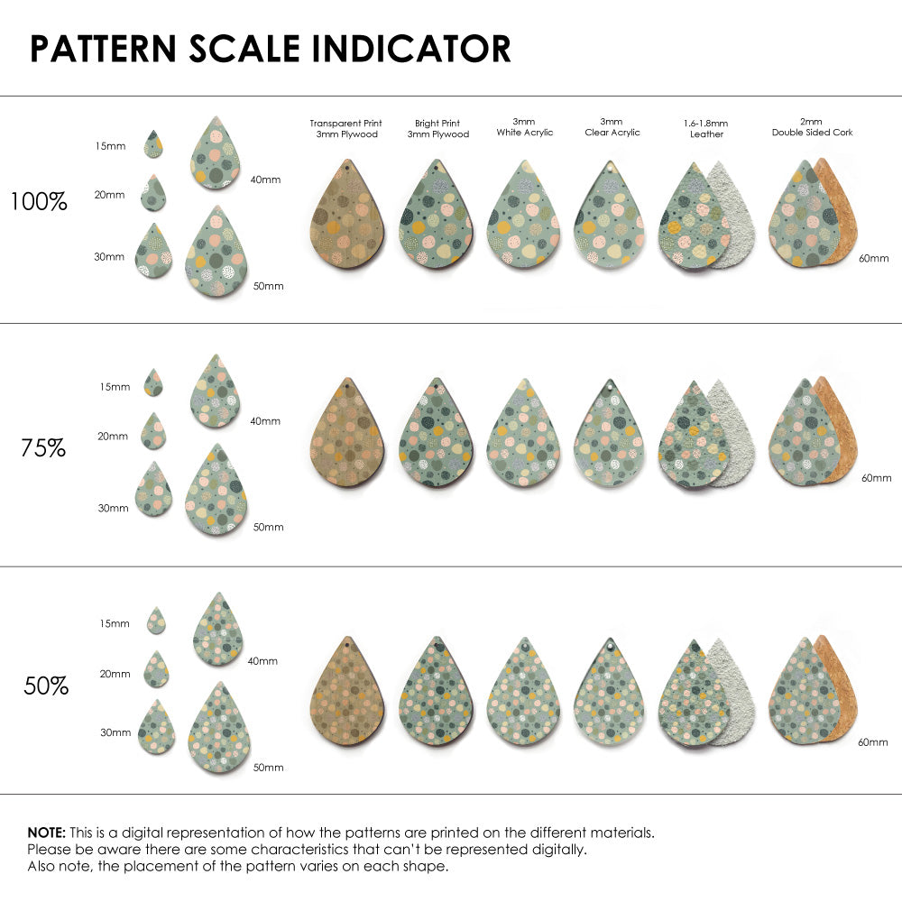 The catalogue image shown is one repeat. If the pattern is seamless, we repeat the pattern to fit to the sheet size, and then scale it so it is suitable for small pieces like earrings.