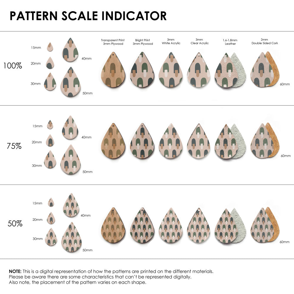 The catalogue image shown is one repeat. If the pattern is seamless, we repeat the pattern to fit to the sheet size, and then scale it so it is suitable for small pieces like earrings.