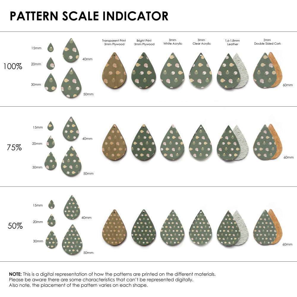 The catalogue image shown is one repeat. If the pattern is seamless, we repeat the pattern to fit to the sheet size, and then scale it so it is suitable for small pieces like earrings.