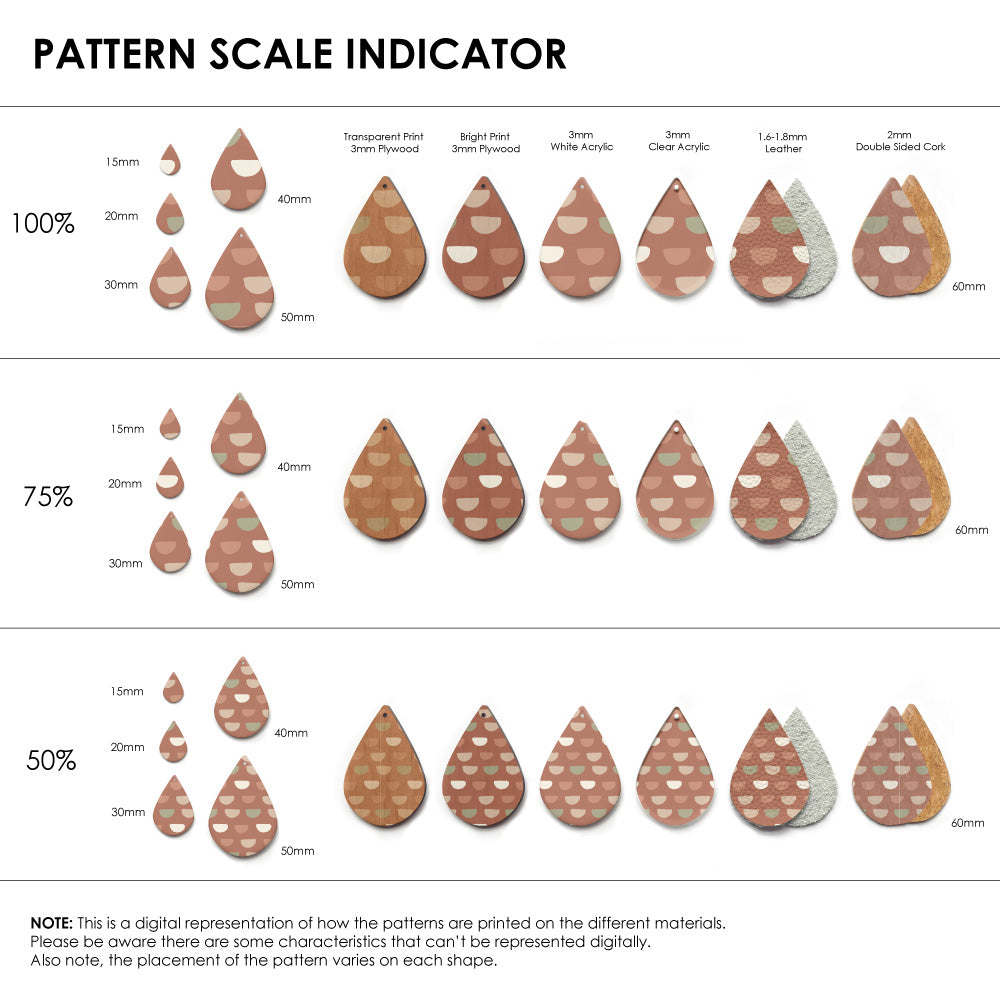 The catalogue image shown is one repeat. If the pattern is seamless, we repeat the pattern to fit to the sheet size, and then scale it so it is suitable for small pieces like earrings.