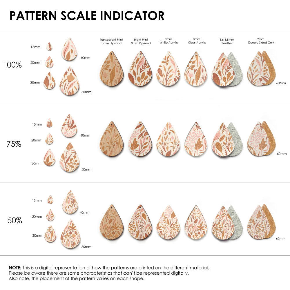 Our patterns can be printed onto Genuine Cowhide Leather, Double Sided Cork, Pine Plywood, White Acrylic or Clear Acrylic or Yupo Paper sheets or earring blanks for making your own earrings. Simply add your own embellishments and findings to make them truly your own.