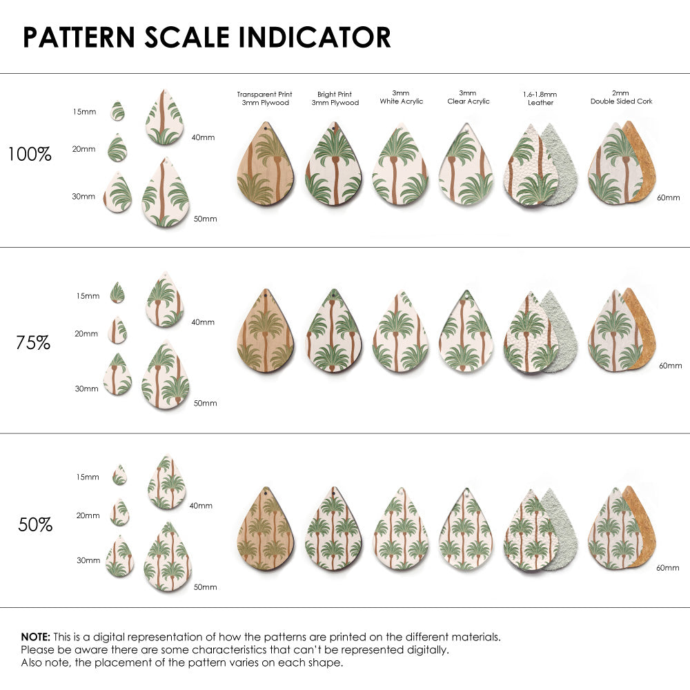 The catalogue image shown is one repeat. If the pattern is seamless, we repeat the pattern to fit to the sheet size, and then scale it so it is suitable for small pieces like earrings.