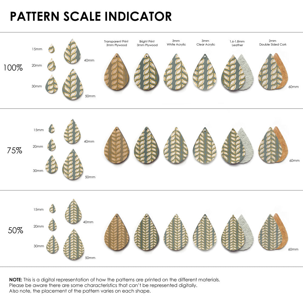 The catalogue image shown is one repeat. If the pattern is seamless, we repeat the pattern to fit to the sheet size, and then scale it so it is suitable for small pieces like earrings.