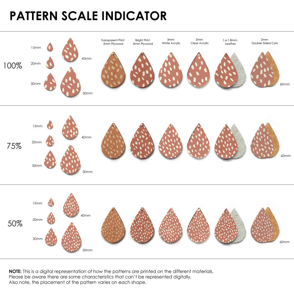 The catalogue image shown is one repeat. If the pattern is seamless, we repeat the pattern to fit to the sheet size, and then scale it so it is suitable for small pieces like earrings.