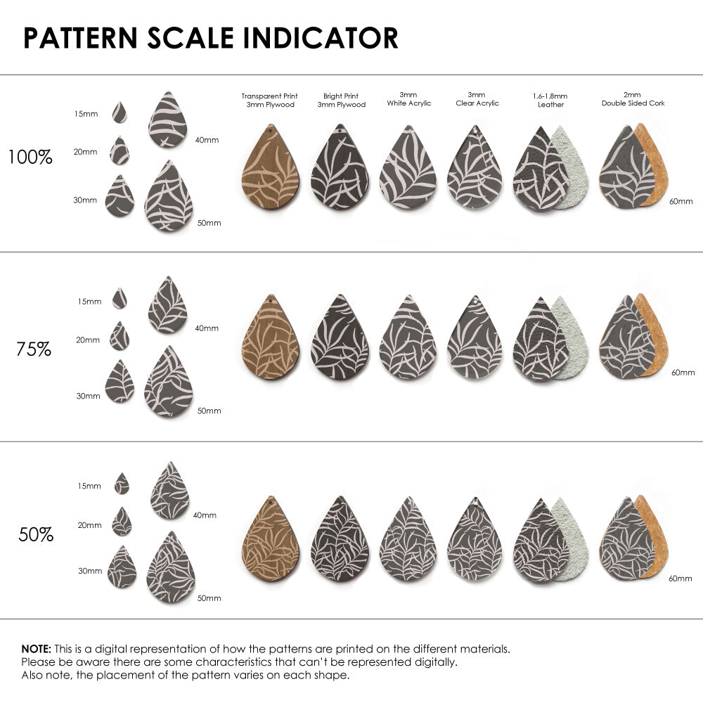 Our patterns can be printed onto Genuine Cowhide Leather, Double Sided Cork, Pine Plywood, White Acrylic or Clear Acrylic or Yupo Paper sheets or earring blanks for making your own earrings. Simply add your own embellishments and findings to make them truly your own.