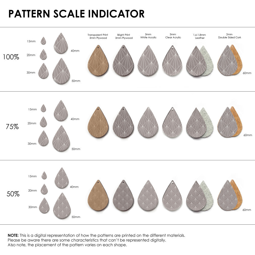 The catalogue image shown is one repeat. If the pattern is seamless, we repeat the pattern to fit to the sheet size, and then scale it so it is suitable for small pieces like earrings.