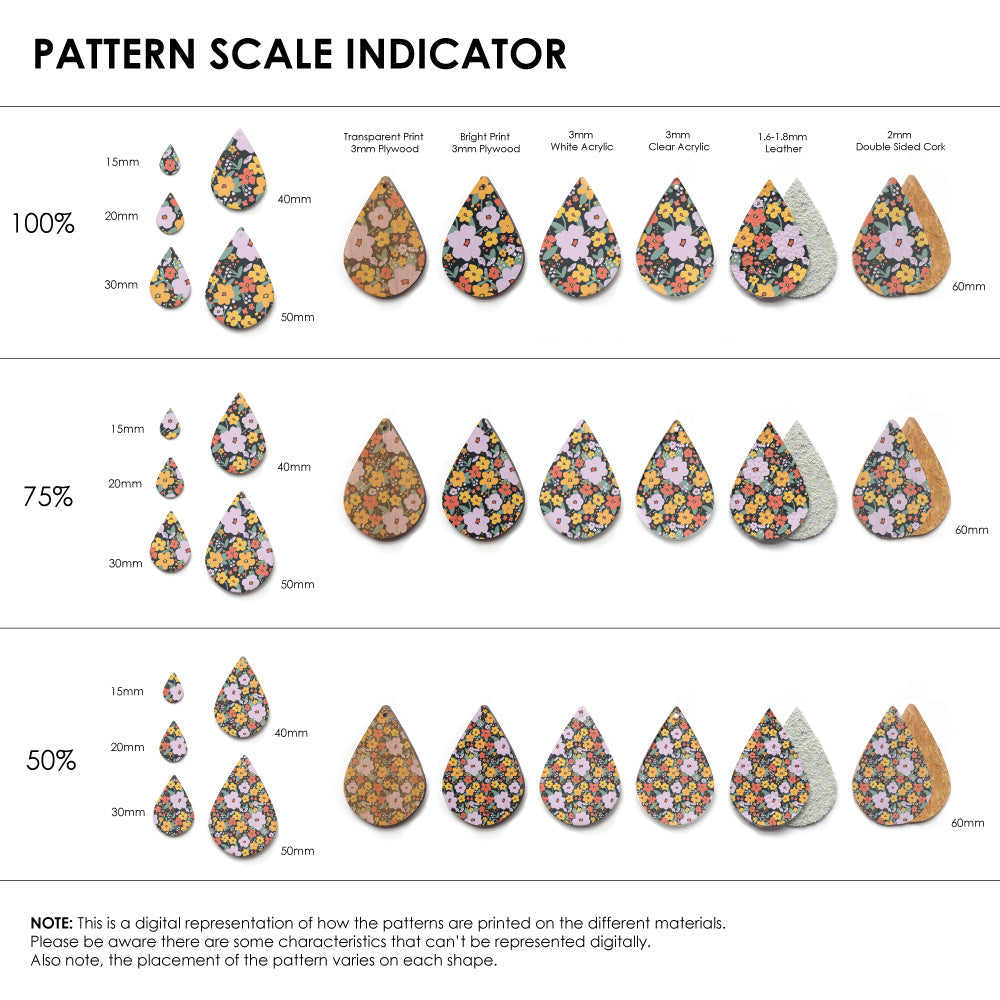 The catalogue image shown is one repeat. If the pattern is seamless, we repeat the pattern to fit to the sheet size, and then scale it so it is suitable for small pieces like earrings.