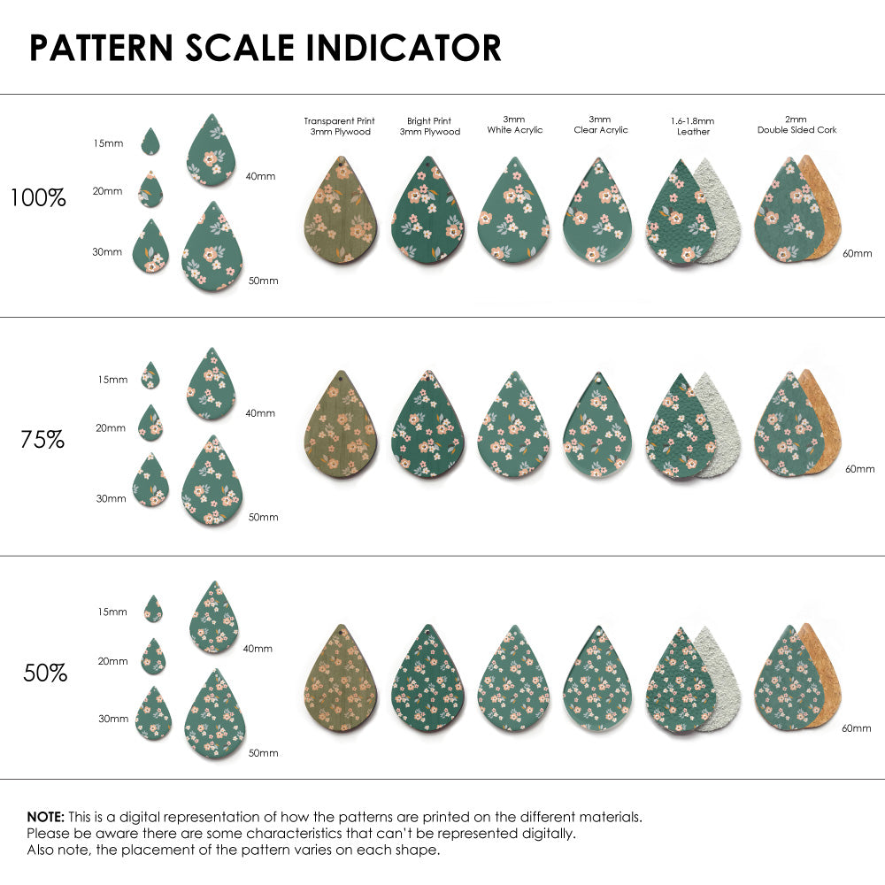 The catalogue image shown is one repeat. If the pattern is seamless, we repeat the pattern to fit to the sheet size, and then scale it so it is suitable for small pieces like earrings.
