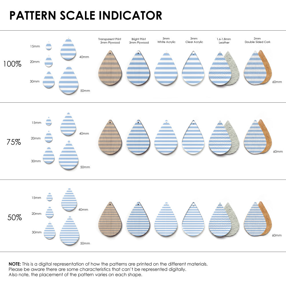 Our patterns can be printed onto Genuine Cowhide Leather, Double Sided Cork, Pine Plywood, White Acrylic or Clear Acrylic or Yupo Paper sheets or earring blanks for making your own earrings. Simply add your own embellishments and findings to make them truly your own.