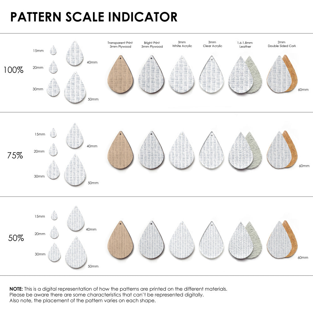 The catalogue image shown is one repeat. If the pattern is seamless, we repeat the pattern to fit to the sheet size, and then scale it so it is suitable for small pieces like earrings.