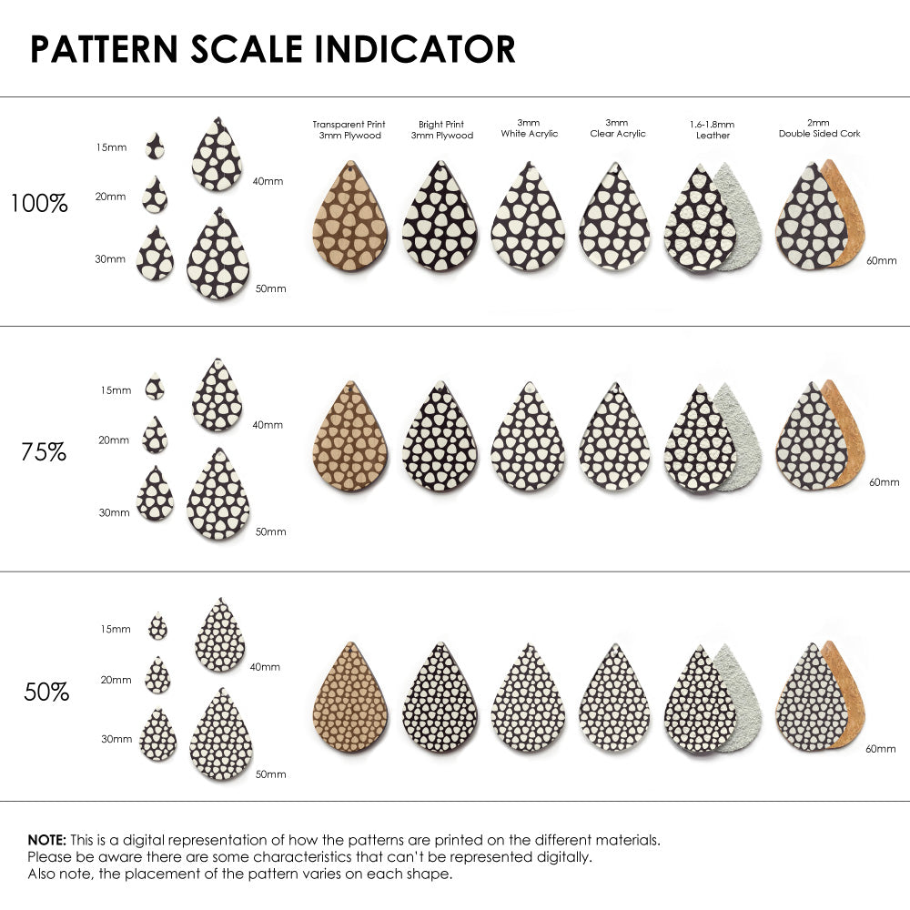 The catalogue image shown is one repeat. If the pattern is seamless, we repeat the pattern to fit to the sheet size, and then scale it so it is suitable for small pieces like earrings.