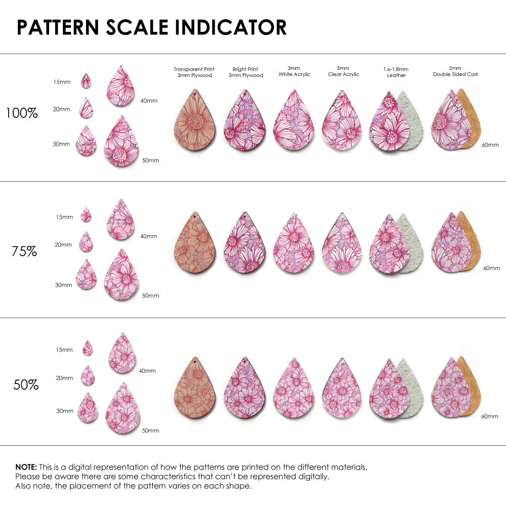 Our patterns can be printed onto Genuine Cowhide Leather, Double Sided Cork, Pine Plywood, White Acrylic or Clear Acrylic or Yupo Paper sheets or earring blanks for making your own earrings. Simply add your own embellishments and findings to make them truly your own.