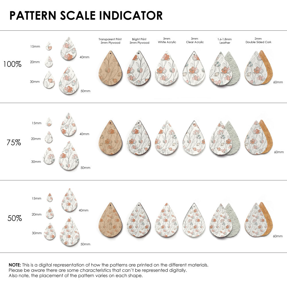Our patterns can be printed onto Genuine Cowhide Leather, Double Sided Cork, Pine Plywood, White Acrylic or Clear Acrylic or Yupo Paper sheets or earring blanks for making your own earrings. Simply add your own embellishments and findings to make them truly your own.