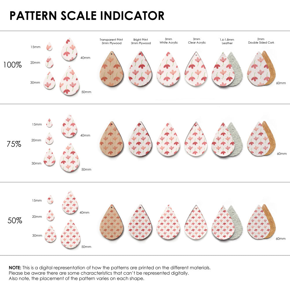The catalogue image shown is one repeat. If the pattern is seamless, we repeat the pattern to fit to the sheet size, and then scale it so it is suitable for small pieces like earrings.