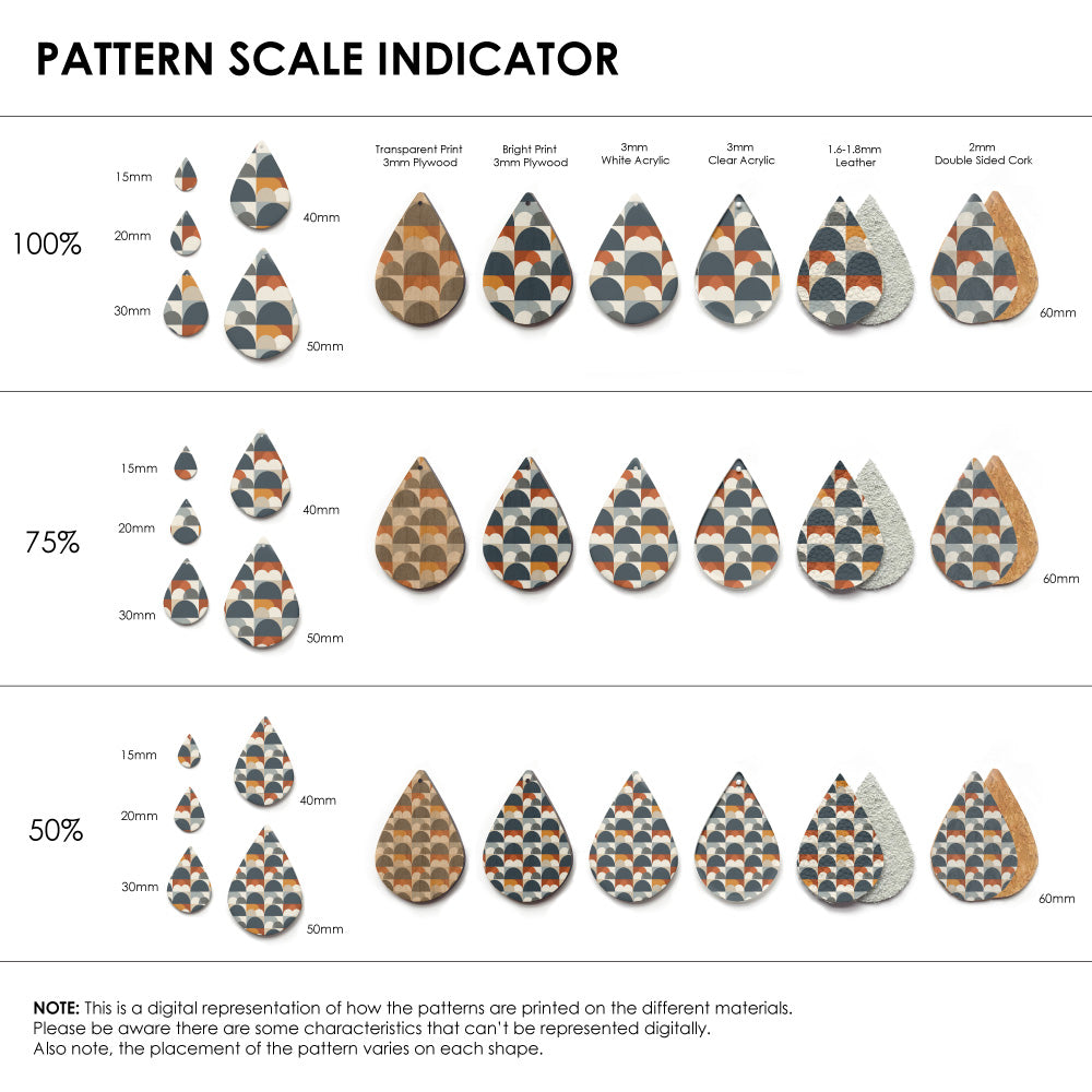 The catalogue image shown is one repeat. If the pattern is seamless, we repeat the pattern to fit to the sheet size, and then scale it so it is suitable for small pieces like earrings.