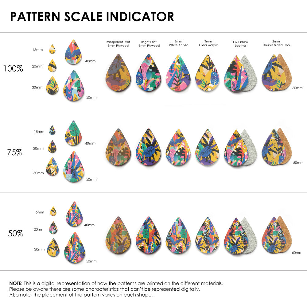 The catalogue image shown is one repeat. If the pattern is seamless, we repeat the pattern to fit to the sheet size, and then scale it so it is suitable for small pieces like earrings.