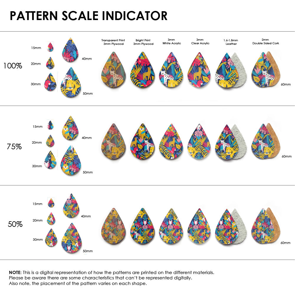 The catalogue image shown is one repeat. If the pattern is seamless, we repeat the pattern to fit to the sheet size, and then scale it so it is suitable for small pieces like earrings.