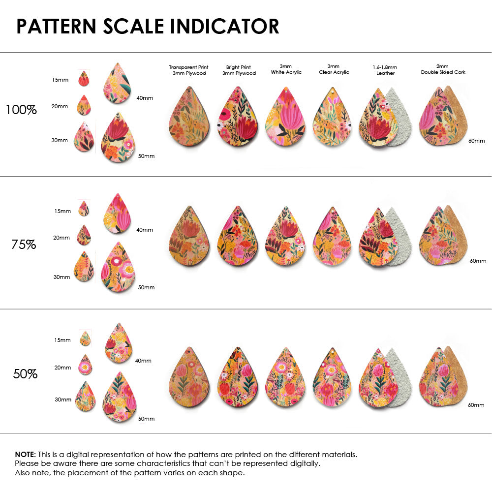 Our patterns can be printed onto Genuine Cowhide Leather, Double Sided Cork, Pine Plywood, White Acrylic or Clear Acrylic or Yupo Paper sheets or earring blanks for making your own earrings. Simply add your own embellishments and findings to make them truly your own.
