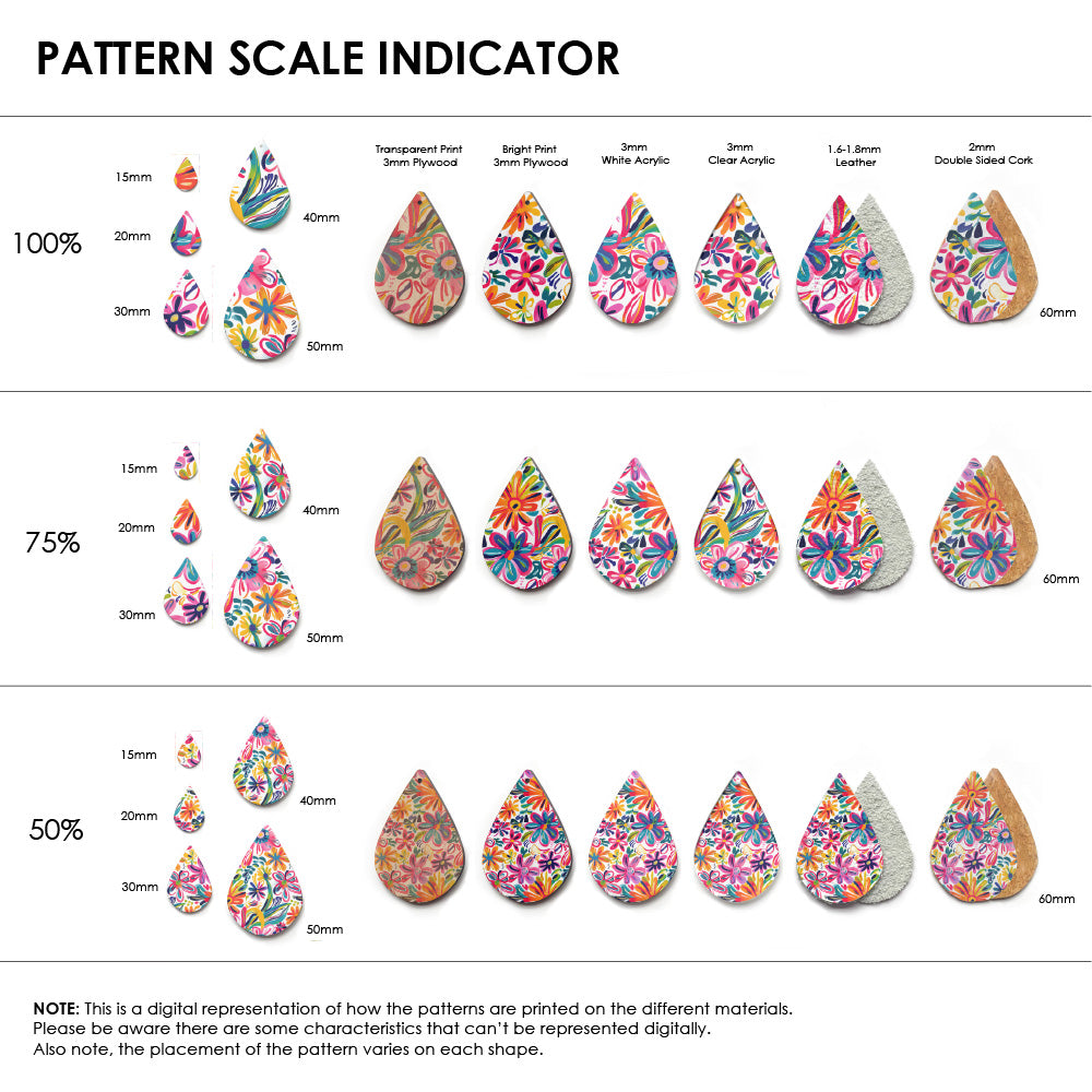 Our patterns can be printed onto Genuine Cowhide Leather, Double Sided Cork, Pine Plywood, White Acrylic or Clear Acrylic or Yupo Paper sheets or earring blanks for making your own earrings. Simply add your own embellishments and findings to make them truly your own.