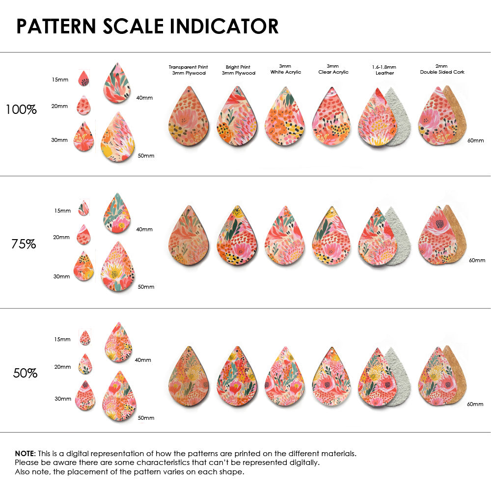 Our patterns can be printed onto Genuine Cowhide Leather, Double Sided Cork, Pine Plywood, White Acrylic or Clear Acrylic or Yupo Paper sheets or earring blanks for making your own earrings. Simply add your own embellishments and findings to make them truly your own.