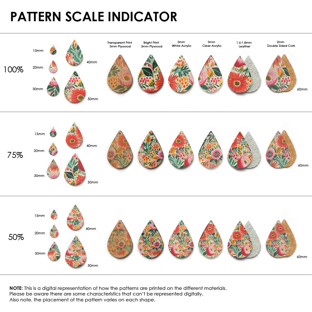 The catalogue image shown is one repeat. If the pattern is seamless, we repeat the pattern to fit to the sheet size, and then scale it so it is suitable for small pieces like earrings.