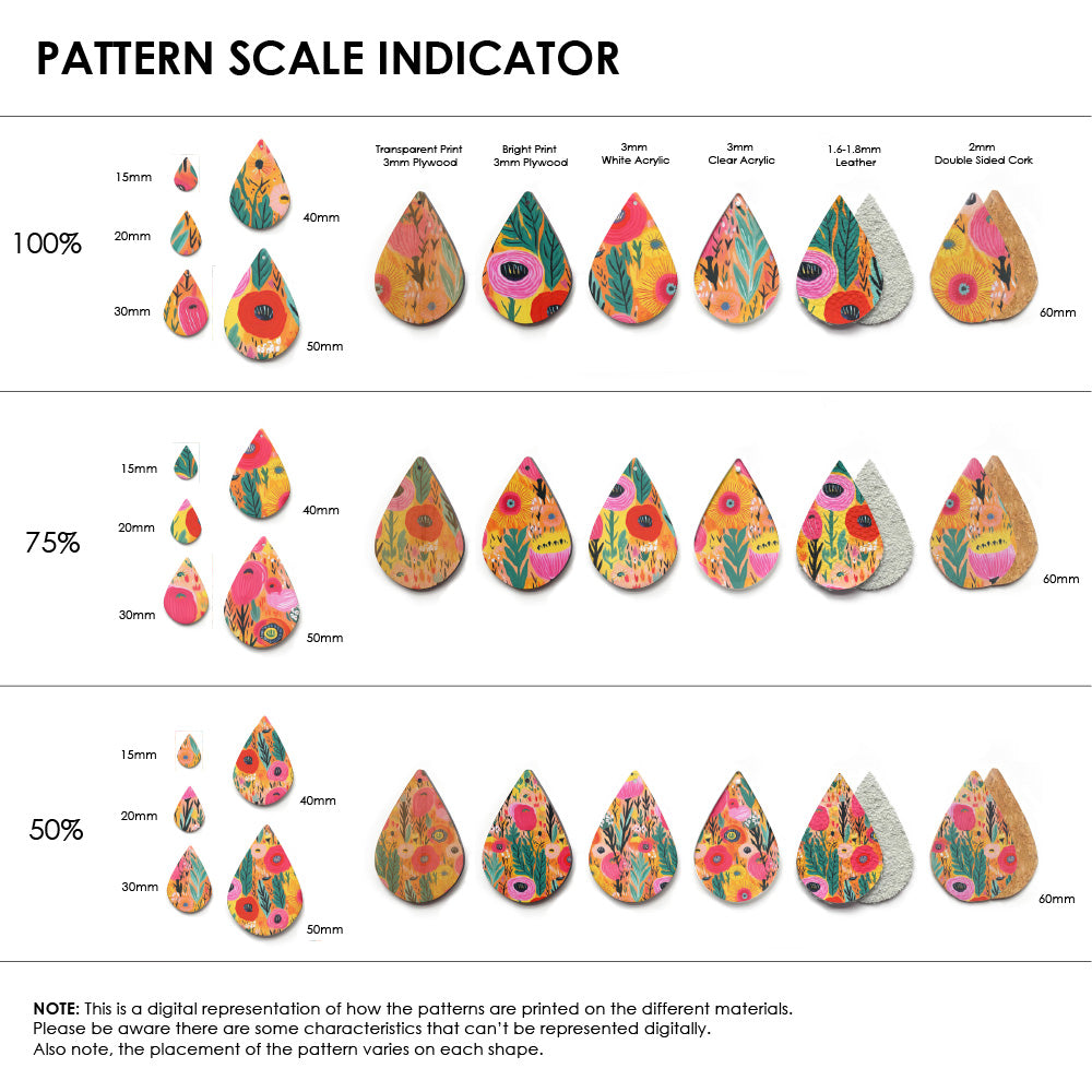 Our patterns can be printed onto Genuine Cowhide Leather, Double Sided Cork, Pine Plywood, White Acrylic or Clear Acrylic or Yupo Paper sheets or earring blanks for making your own earrings. Simply add your own embellishments and findings to make them truly your own.