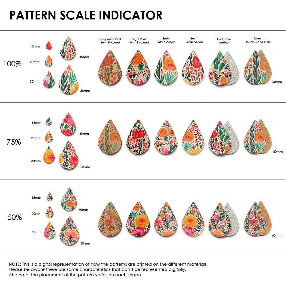 Our patterns can be printed onto Genuine Cowhide Leather, Double Sided Cork, Pine Plywood, White Acrylic or Clear Acrylic or Yupo Paper sheets or earring blanks for making your own earrings. Simply add your own embellishments and findings to make them truly your own.