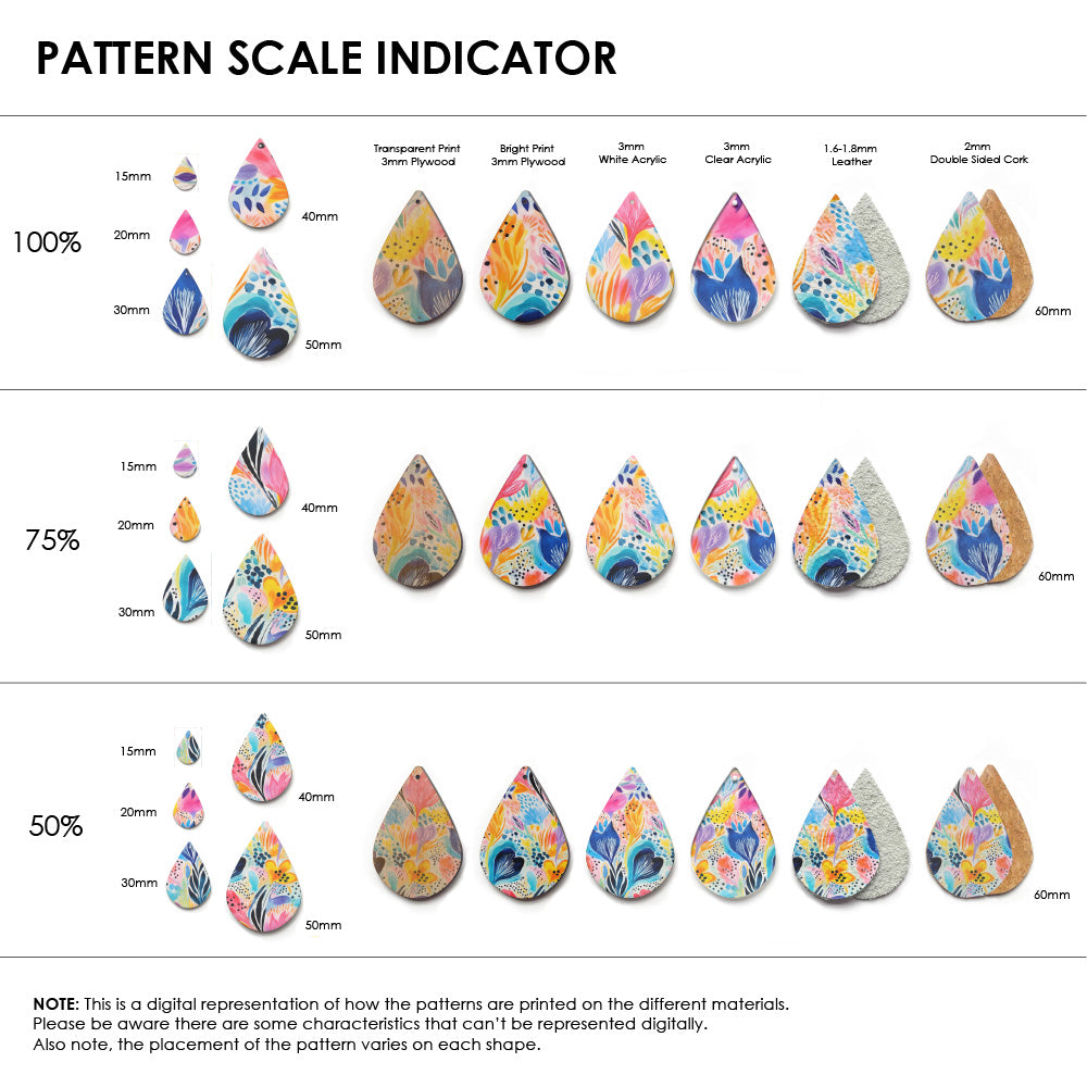 Our patterns can be printed onto Genuine Cowhide Leather, Double Sided Cork, Pine Plywood, White Acrylic or Clear Acrylic or Yupo Paper sheets or earring blanks for making your own earrings. Simply add your own embellishments and findings to make them truly your own.