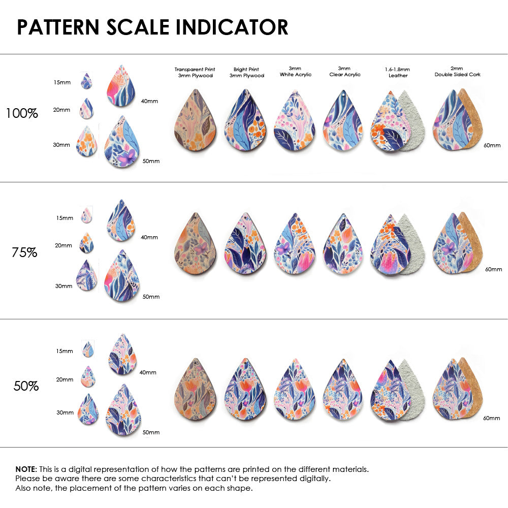 Our patterns can be printed onto Genuine Cowhide Leather, Double Sided Cork, Pine Plywood, White Acrylic or Clear Acrylic or Yupo Paper sheets or earring blanks for making your own earrings. Simply add your own embellishments and findings to make them truly your own.