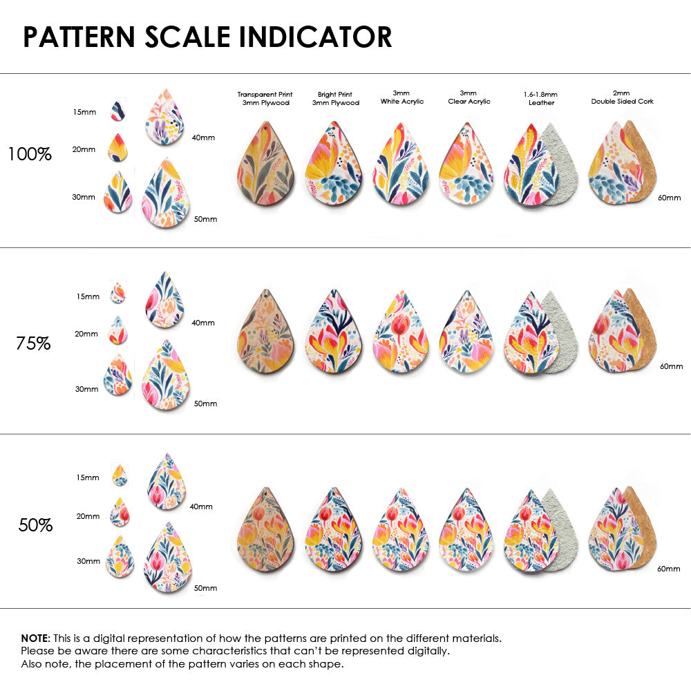 Our patterns can be printed onto Genuine Cowhide Leather, Double Sided Cork, Pine Plywood, White Acrylic or Clear Acrylic or Yupo Paper sheets or earring blanks for making your own earrings. Simply add your own embellishments and findings to make them truly your own.