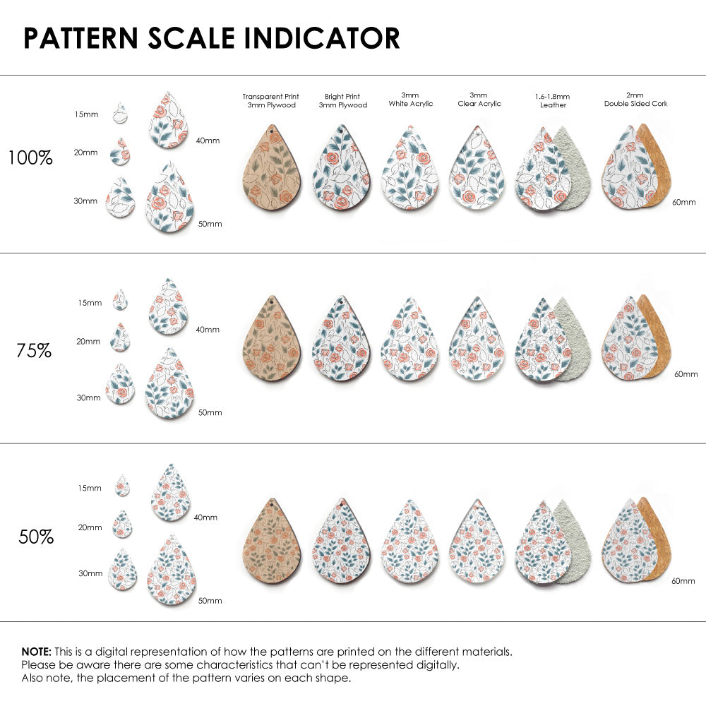 Our patterns can be printed onto Genuine Cowhide Leather, Double Sided Cork, Pine Plywood, White Acrylic or Clear Acrylic or Yupo Paper sheets or earring blanks for making your own earrings. Simply add your own embellishments and findings to make them truly your own.