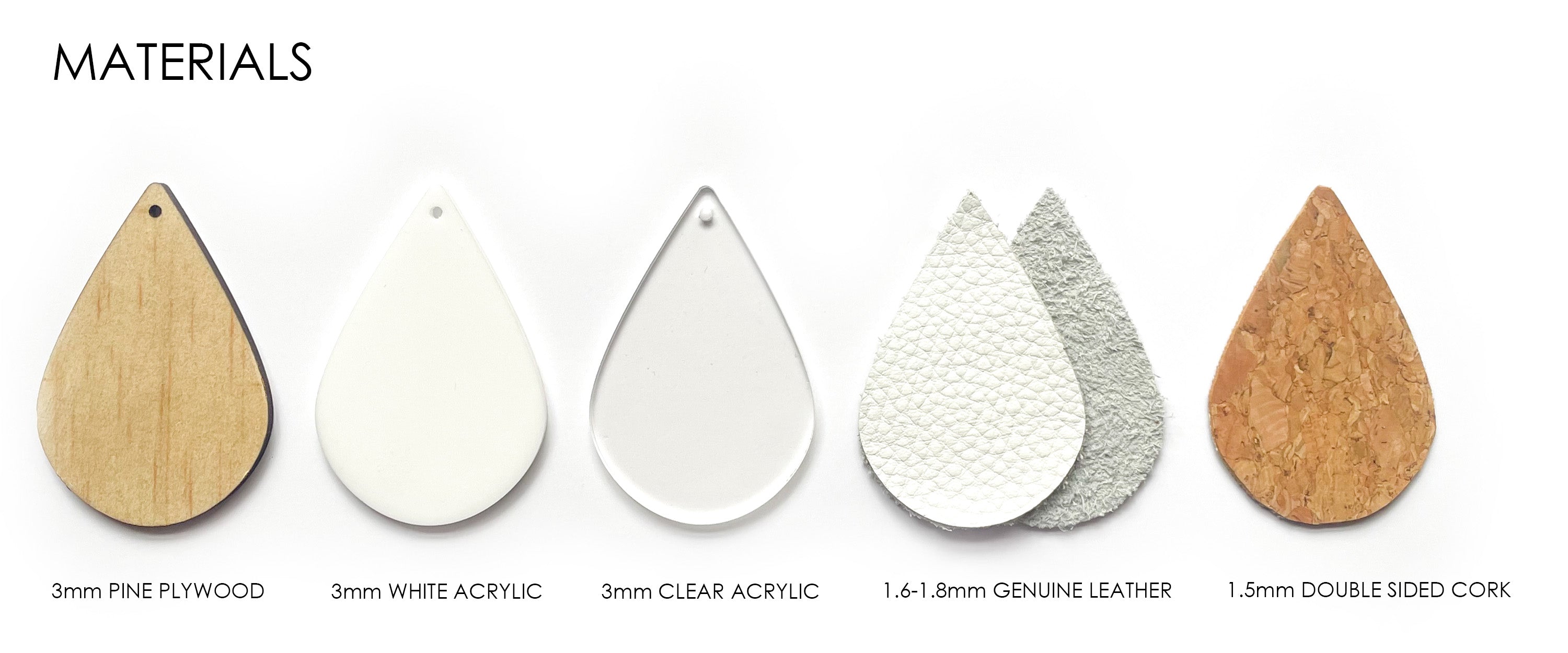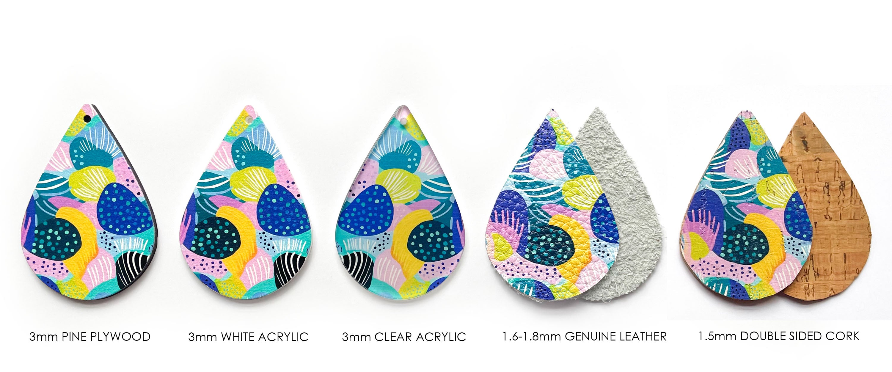Your pattern can be printed onto Genuine Cowhide Leather, Doubled Sided Cork, Pine Plywood, White Acrylic or Clear Acrylic earring blanks for making your own earrings. Simply add your own embellishments and findings to make them truly your own.