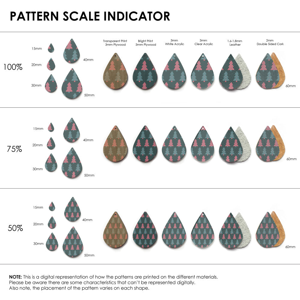 The catalogue image shown is one repeat. If the pattern is seamless, we repeat the pattern to fit to the sheet size, and then scale it so it is suitable for small pieces like earrings.