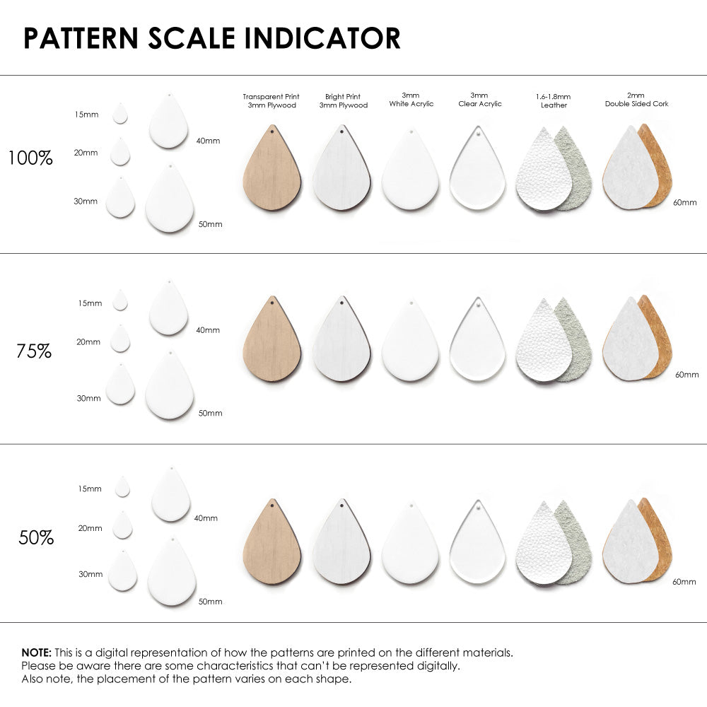 Our patterns can be printed onto Genuine Cowhide Leather, Double Sided Cork, Pine Plywood, White Acrylic or Clear Acrylic or Yupo Paper sheets or earring blanks for making your own earrings. Simply add your own embellishments and findings to make them truly your own.