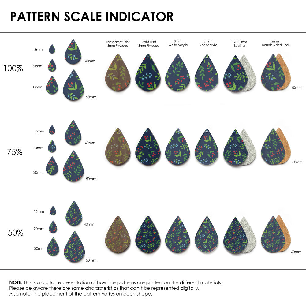 The catalogue image shown is one repeat. If the pattern is seamless, we repeat the pattern to fit to the sheet size, and then scale it so it is suitable for small pieces like earrings.