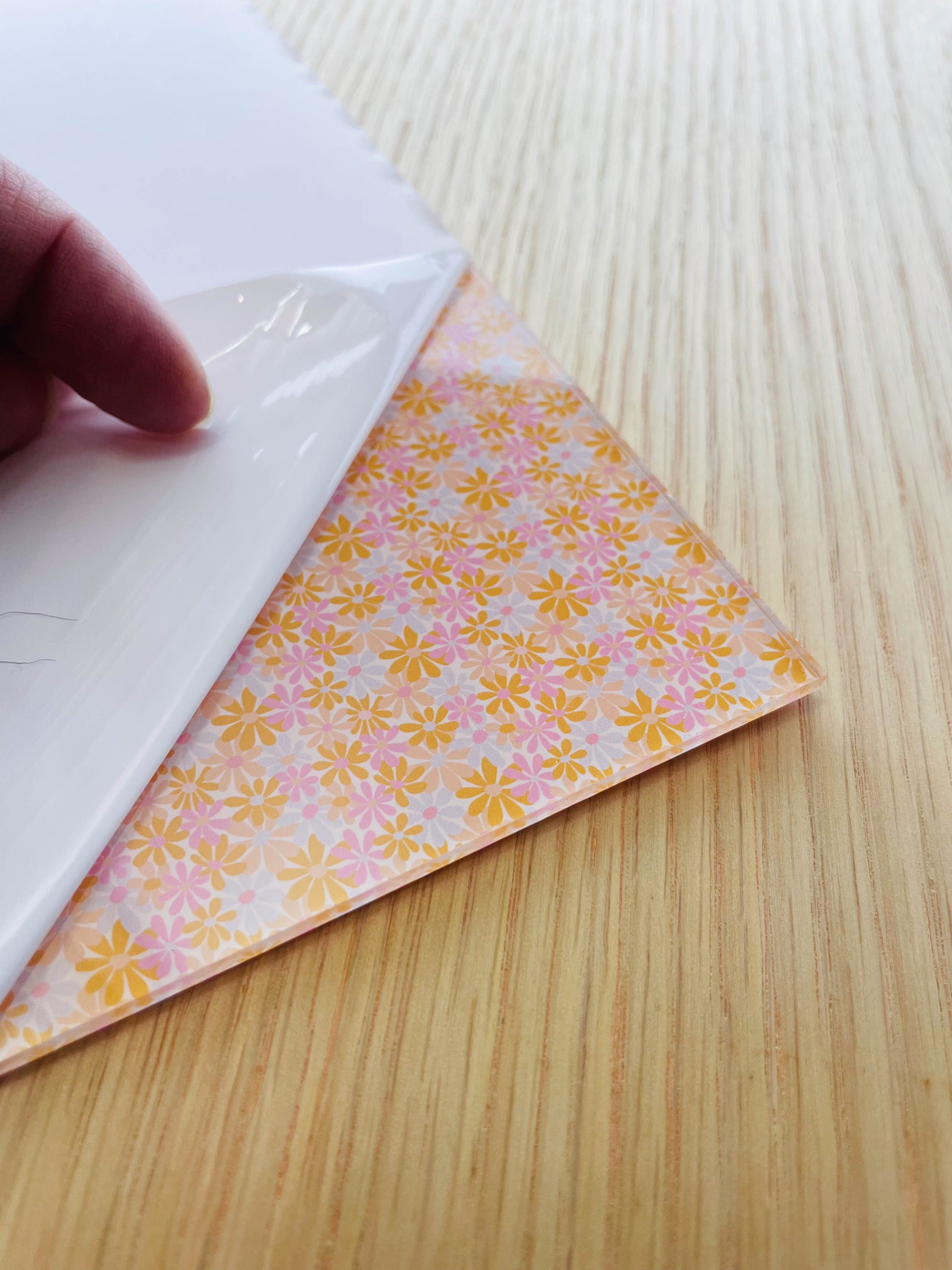 The pattern is printed on the back side of the clear acrylic. You will see the pattern through the acrylic which gives it a beautiful gloss finish.