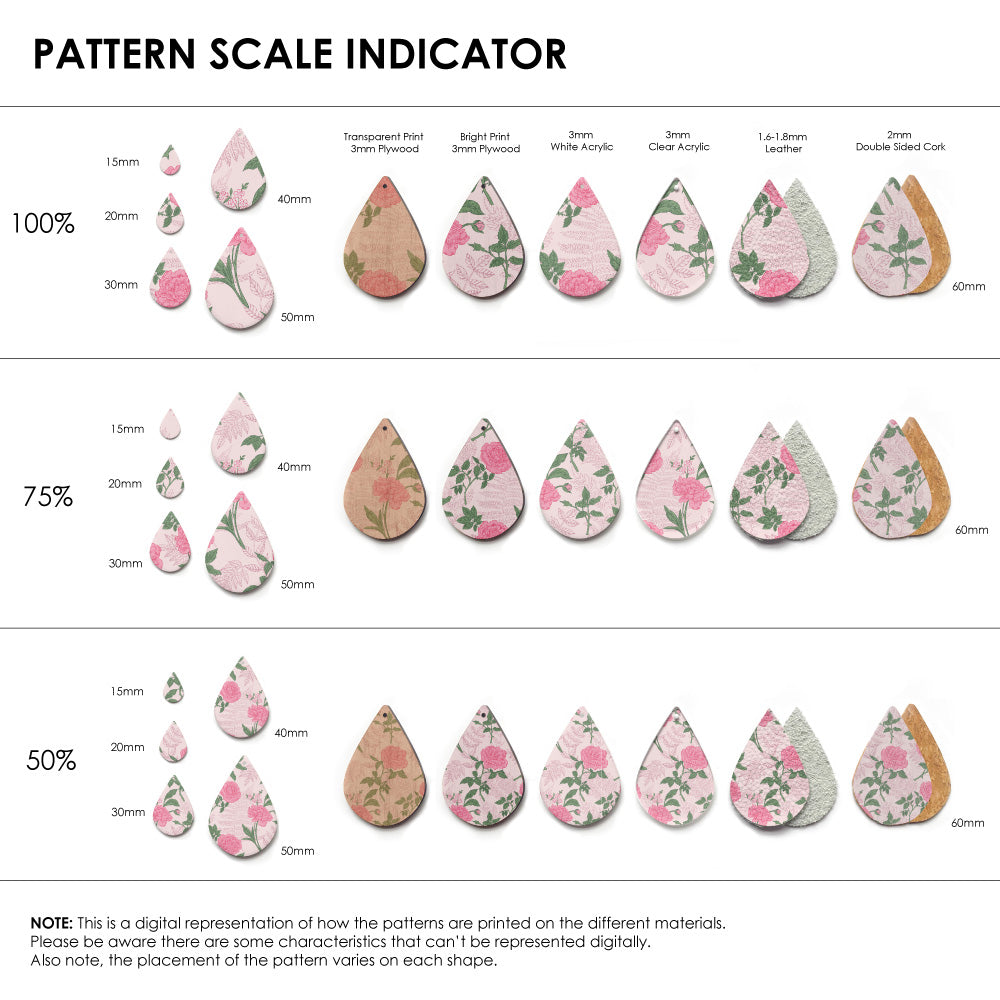 The catalogue image shown is one repeat. If the pattern is seamless, we repeat the pattern to fit to the sheet size, and then scale it so it is suitable for small pieces like earrings.